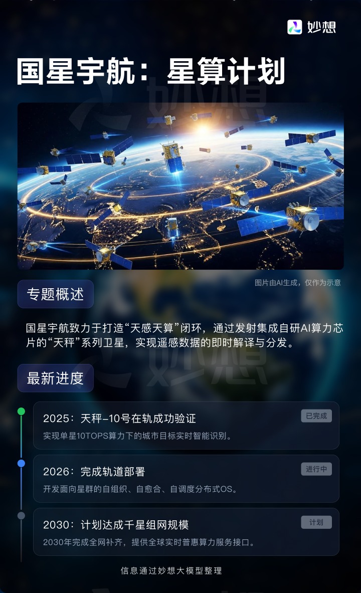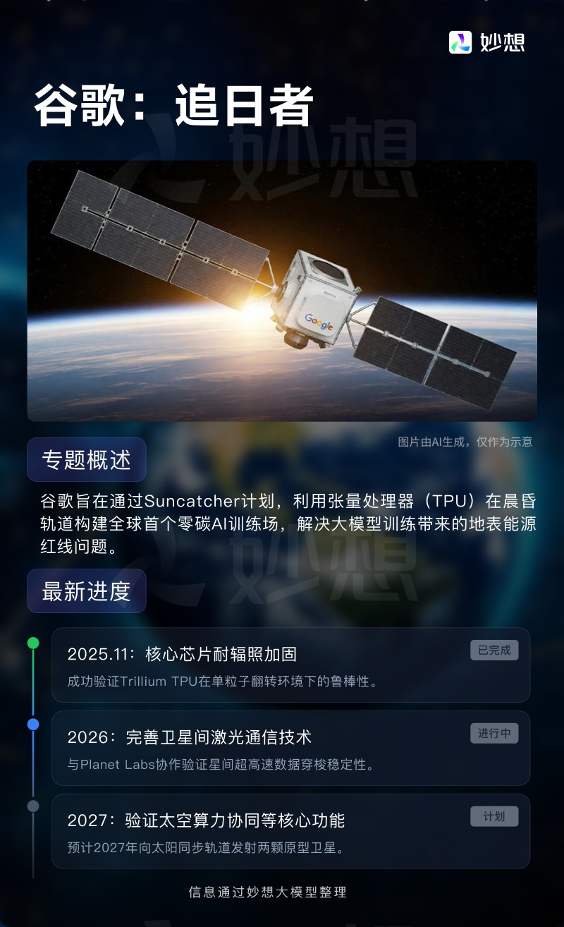 科技巨头谷歌也入局该领域,其“追日者”计划已完成 TPU 芯片的耐辐照加固验证,正推进星间激光通信技术优化,计划 2027年发射原型卫星。