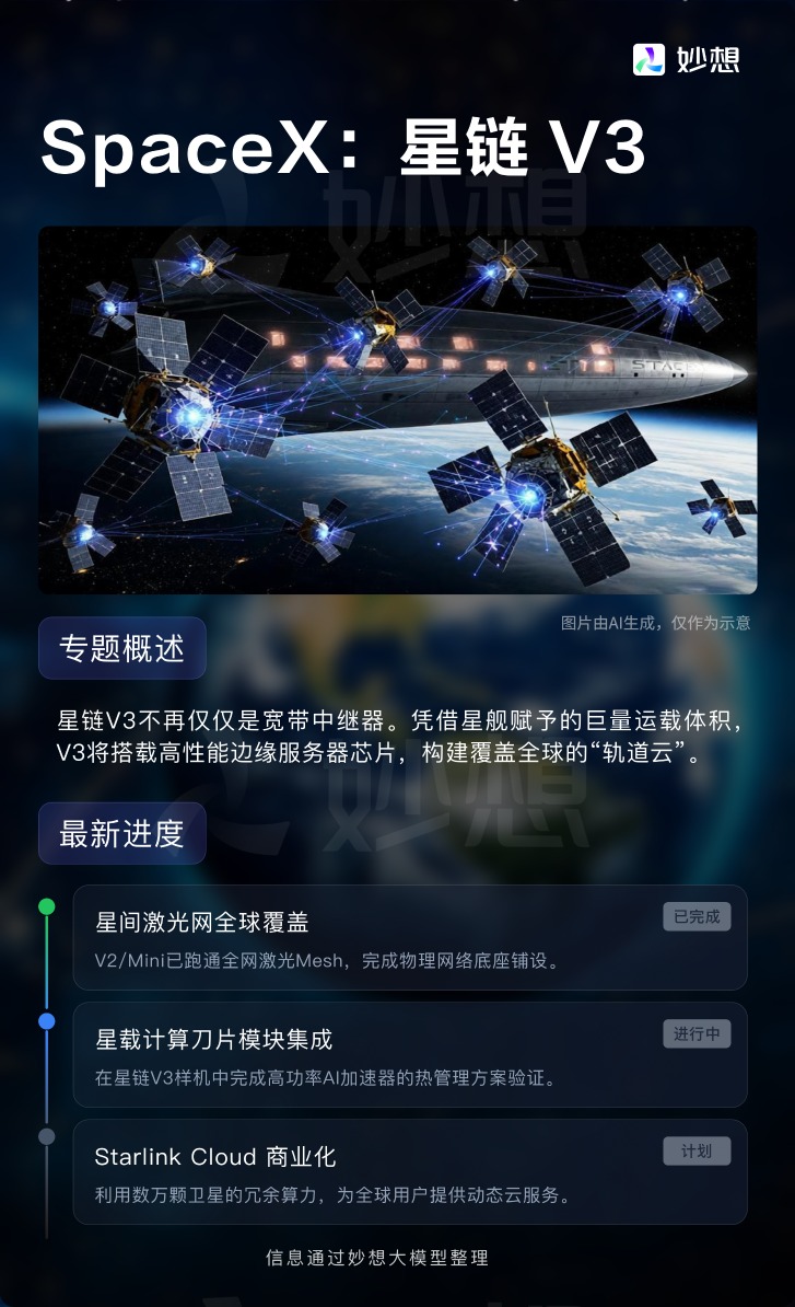 SpaceX方面,其星链V3项目已完成星间激光网的全球覆盖,星载计算刀片模块集成处于验证阶段,计划依托星舰的大运载能力,搭载高性能边缘服务器芯片构建 “轨道云”,后续将开放星链冗余算力的云服务商业化。